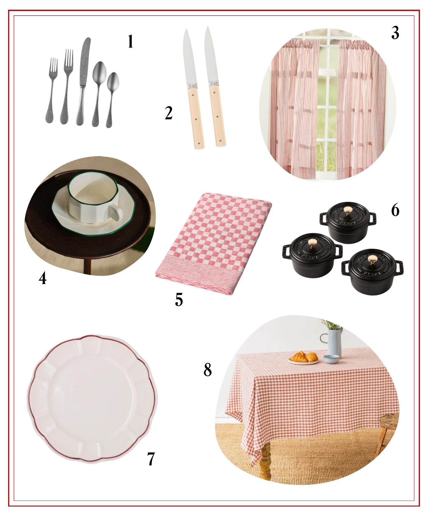 1. Brushed Stainless Steel Flatware | 2. Perceval Steak Knives | 3. Ticking Stripe Café Curtains | 4. Cup and Saucer | 5. Linen Dish Towel | 6. Mini Staubs | 7. Side Plates | 8. Linen Tablecloth