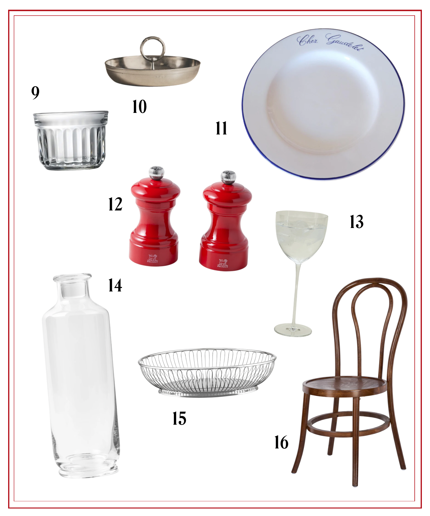 9. Mini Butter Dishes | 10. Pewter Serving Dish | 11. Custom Bistro Plates | 12. Peugot Salt + Pepper Grinders | 13. Stemware Water Glass (iykyk) | 14. Water Carafe | 15. Bread Basket | 16. Bistro Chair